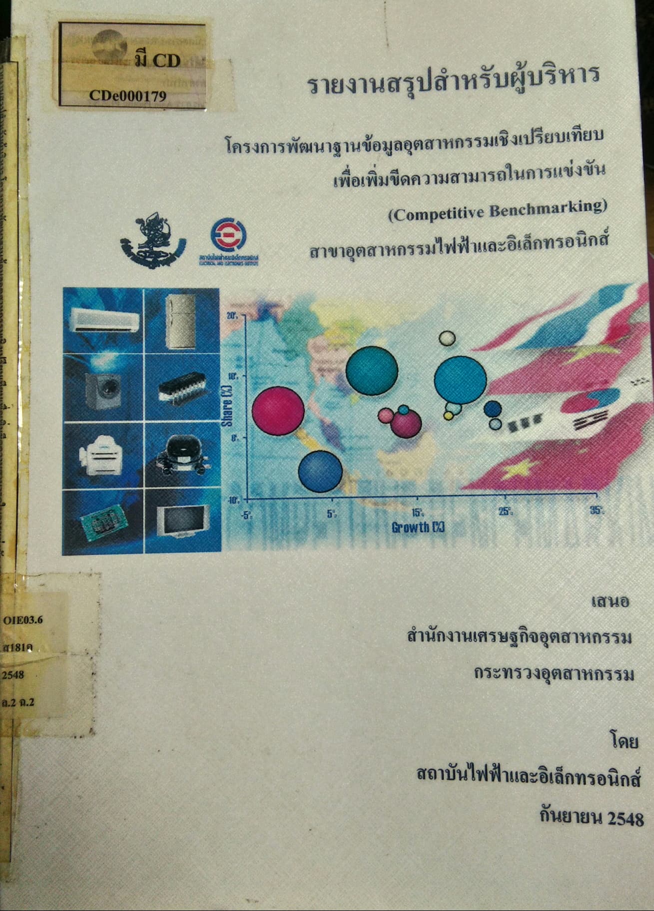 | ชื่อเรื่อง | รายงานสรุปสำหรับผู้บริหาร โครงการจัดทำข้อมูลอุตสาหกรรมเชิงเปรียบเทียบเพื่อเพิ่มขีดความสามารถในการแข่งขัน (Competitive Benchmarking) |